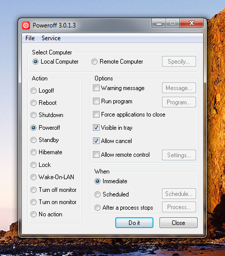 Power off is a Freeware application used to perform shutdown tasks immediately, Scheduled and when a process stops. Below is the main screen of Poweroff software running on Windows 7.